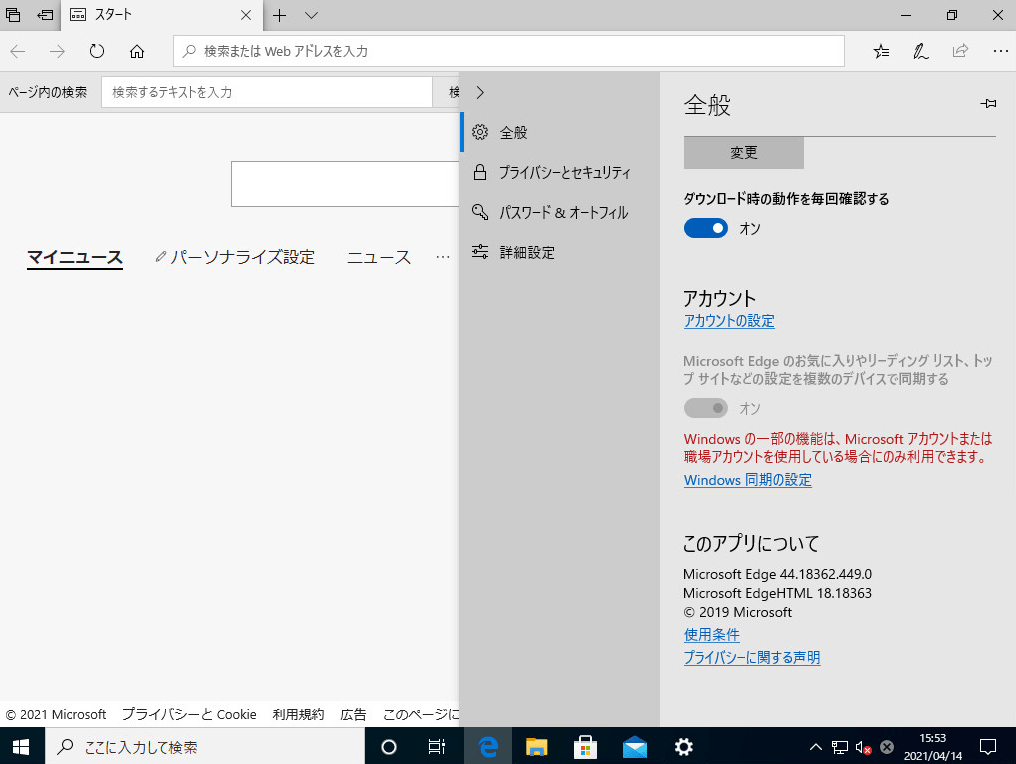 ② 全般設定から バージョン情報が ”44.18362.449.0” であり、レガシー版そのものです。
