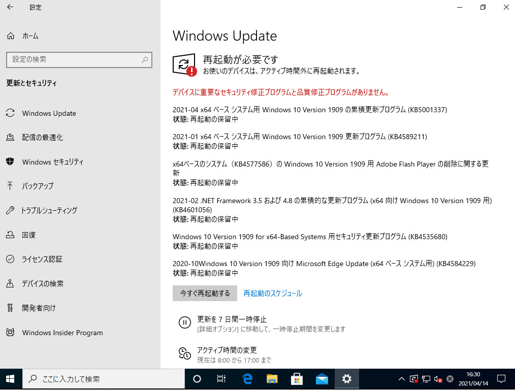 ④ Windows Update を実行し、2021 年 4月 の累積更新プログラムとあわせて、Microsoft Edge Update および Adobe Flash Player の削除 が適用されたことが分かります。「今すぐ再起動する」で OS を再起動しました。